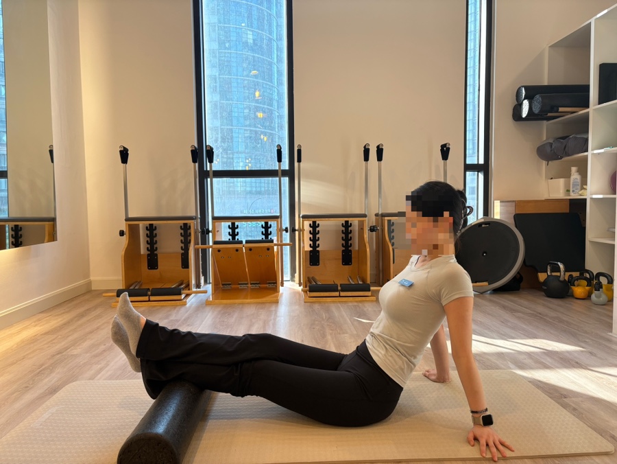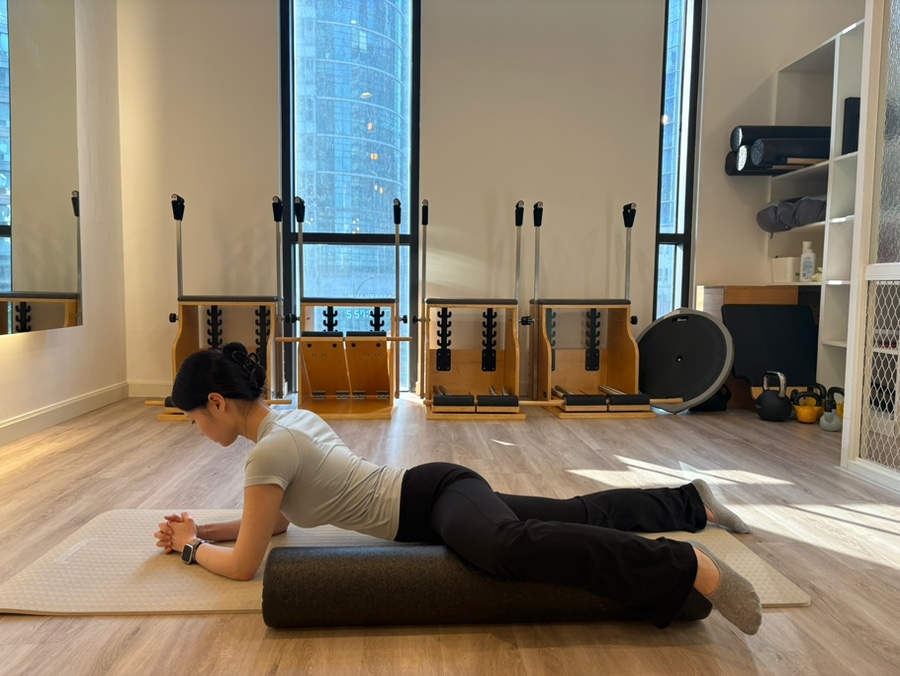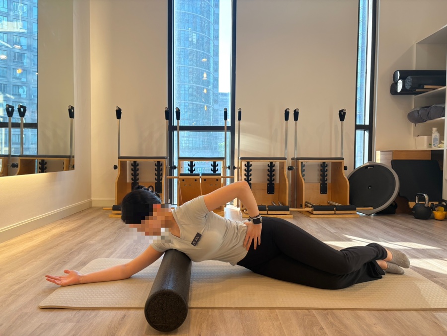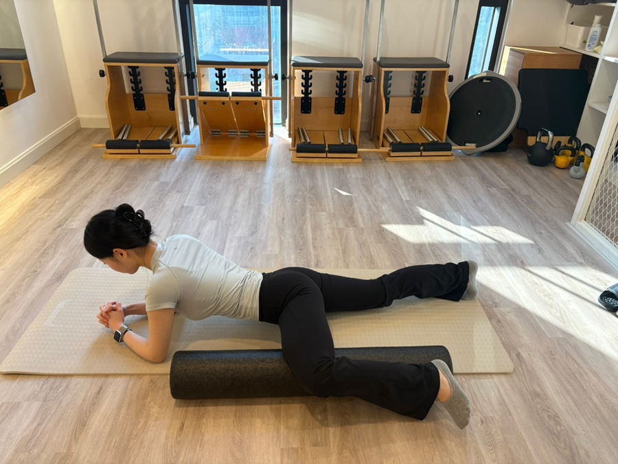 허벅지 안쪽을 폼롤러 위에 올려줍니다.