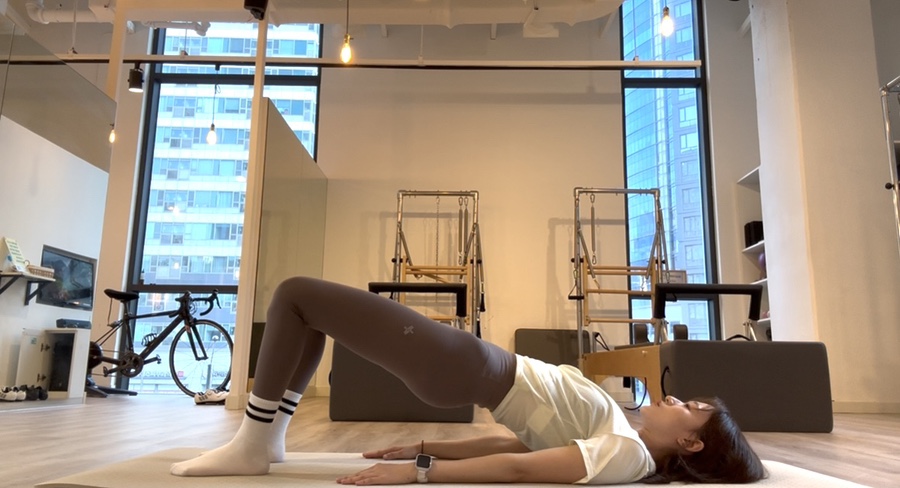 4. 내쉬는 호흡에 꼬리뼈– 엉치뼈– 허리 뼈– 등뼈 순서로 들어 올립니다.