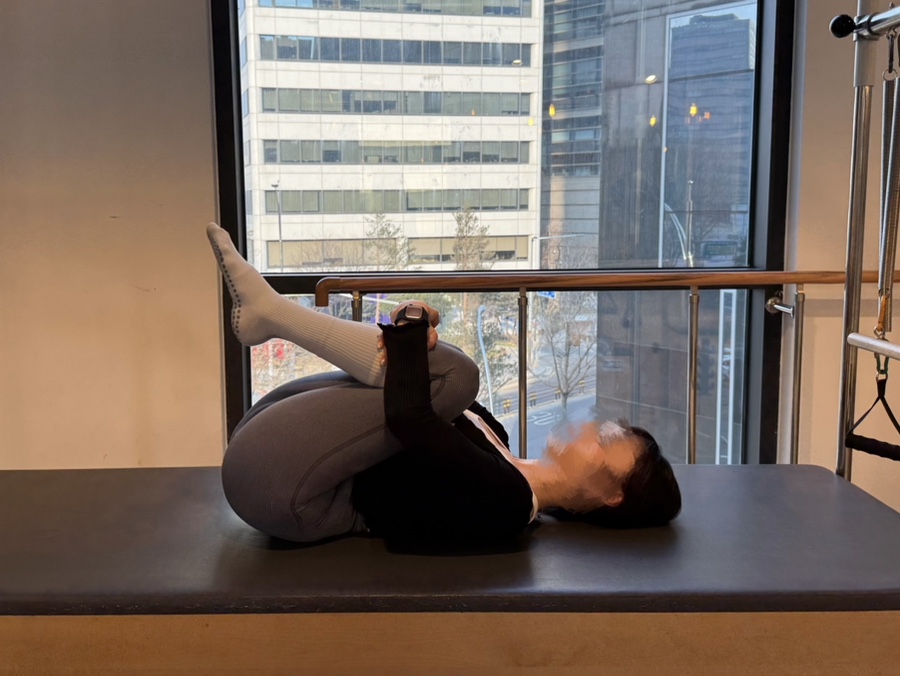 1. 누운 자세에서 양 무릎을 가슴으로 끌어 안아줍니다.