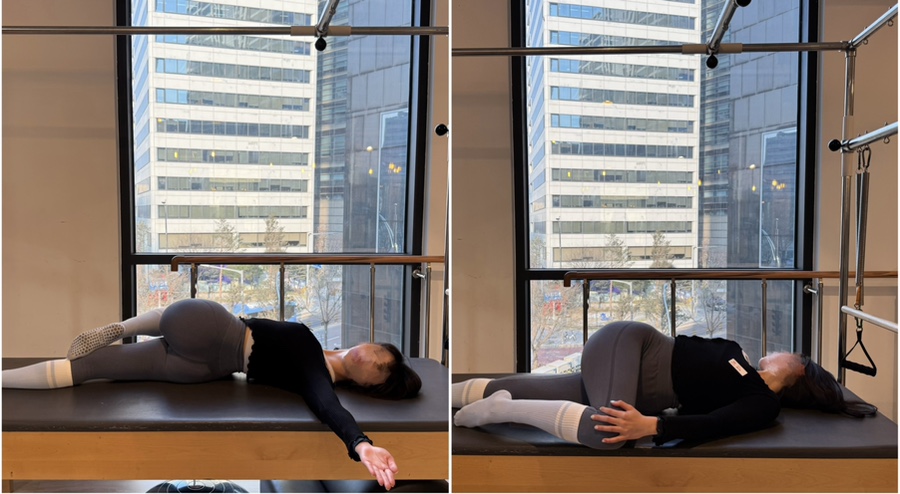 2. 반대쪽으로 넘어간 무릎을 같은 쪽 손으로 잡고